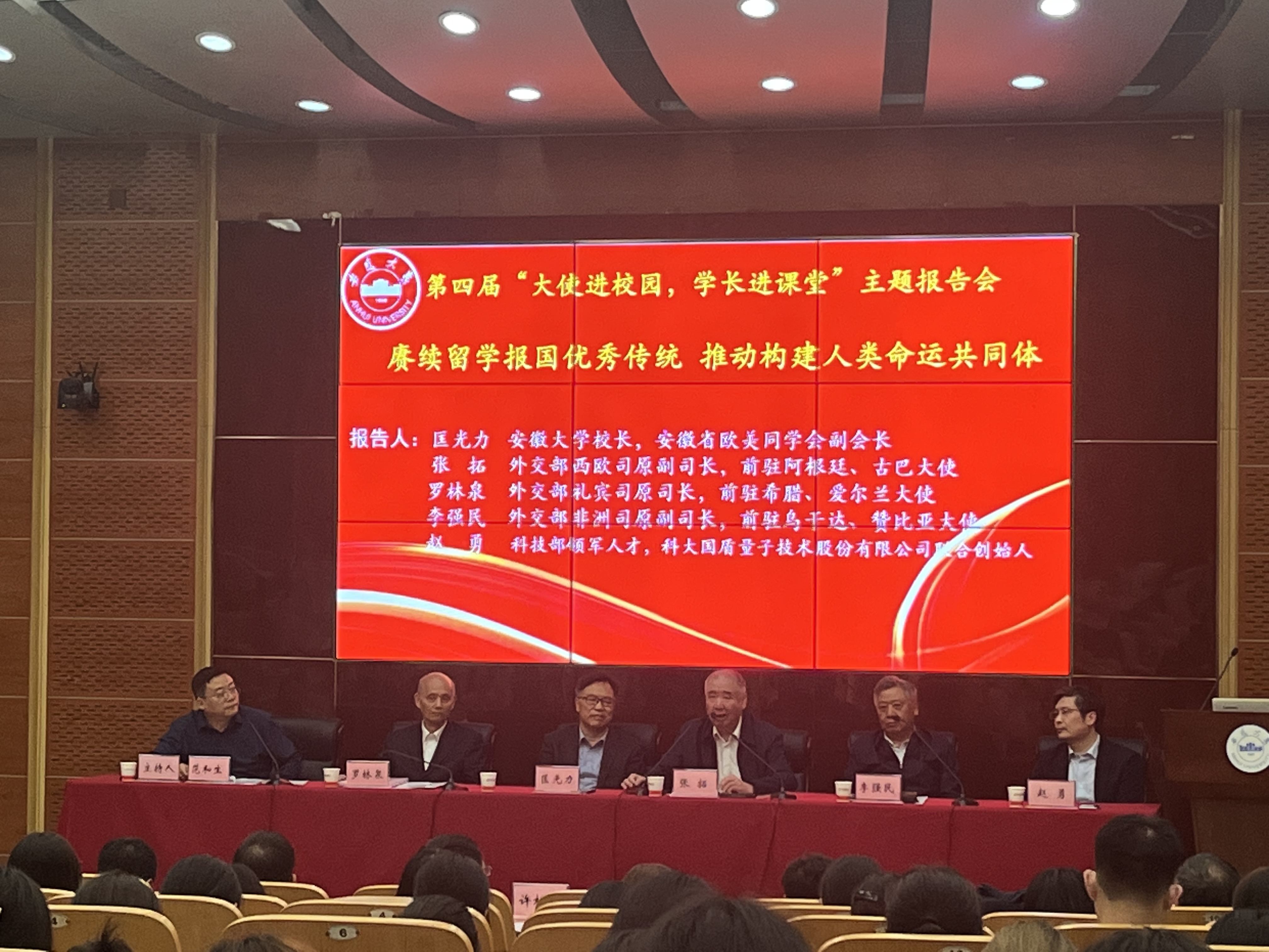 第三场活动为“赓续留学报国优秀传统 推动构建人类命运共同体”主题报告会。匡光力校长出席会议并致辞。匡校长首先对各位大使、嘉宾的到来表示热烈欢迎,并介绍了我校“双一流”建设情况。他指出,在“材料科学与工程”世界一流学科引领下,我校聚焦国家战略和地方发展,大力推进学科交叉,积极融入区域创新,呈现理工人文齐头并进、整体发展更加向好的良好势头。安徽大学将坚定成为助力科技自立自强的“排头兵”,坚定成为服务社会治理的“领头雁”,坚定成为对外开放合作的“桥头堡”。