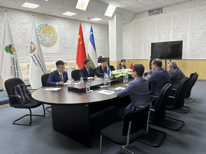 在乌兹别克斯坦国立农业大学、塔什干国立东方研究大学,周飞先后与两校副校长阿不都·瓦西科夫、诺蒂尔·阿卜杜拉耶夫举行工作会谈。周飞介绍了安徽大学的办学历史、办学特色、学科优势以及对外交流等情况。他说,乌兹别克斯坦是中国友好近邻,虽然是我校首访,但近年来在“一带一路”倡议背景下经济交往日渐频繁,人才需求日益扩大,加强校际合作意义重大、前景广阔。阿不都瓦西科夫说,该校虽然是农业大学,以农业科学为主,但与安徽大学合作对该校具有重要意义,希望安徽大学支持该校建立中国中心,大力开展汉语教育,为两校师生合作奠定坚实基础。诺蒂尔·阿卜杜拉耶夫期望两校全方位合作,加强人文交流,合作开展两国经典外译工作。在乌期间,周飞一行还走访上合组织民间外交中心,与中心主任卡布尔容·萨比罗夫等有关人士进行了深入交流。