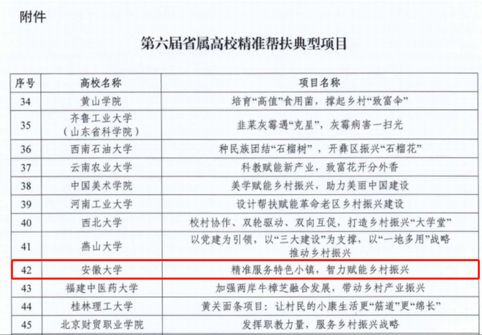 本网讯(校乡村振兴领导小组办公室 王景峰)近日,教育部公布第六届省属高校精准帮扶典型项目推选结果。全国共有30个省级教育行政部门和11所部省合建高校推荐了180个项目,经32个省级教育行政部门和64所承担定点帮扶任务的直属高校投票推选, 共推选出 29个省区市及新疆生产建设兵团的61所高校的典型项目。我校推荐的“精准服务特色小镇,智力赋能乡村振兴”成功入选。