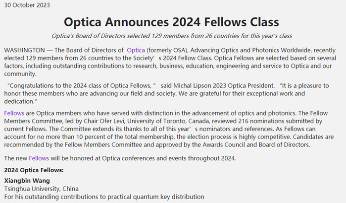 本网讯(物理与光电工程学院)10月30日,美国光学学会发布了2024年度新当选会士名单,此次共有来自26个国家的129位学者入选。我校物理与光电工程学院杰出校友、清华大学物理系王向斌教授榜上有名,当选理由为:在实用量子密钥分发领域做出杰出贡献。