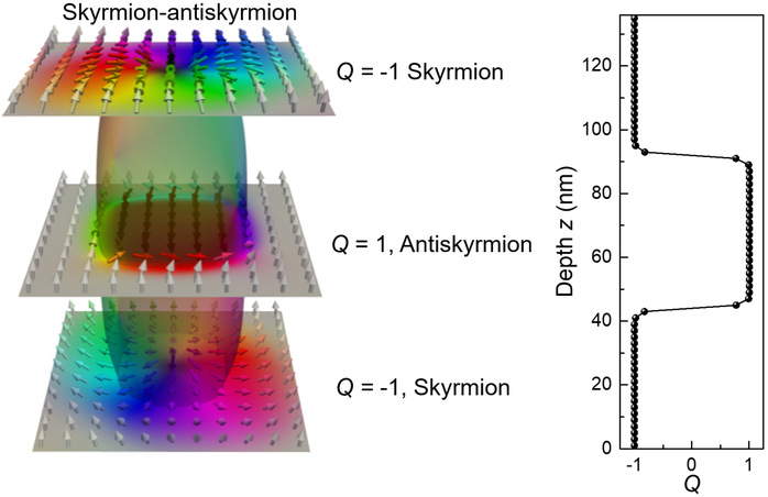 磁斯格明子是一类涡旋状拓扑自旋结构,具有类粒子属性。类似于粒子-反粒子,斯格明子也具有与其拓扑序参量相反的“反粒子”:反斯格明子。与斯格明子相比,反斯格明子具有反型涡旋性。斯格明子-反斯格明子耦合不仅能够用来模拟粒子-反粒子作用等基础物理科学问题,其霍尔天平动力学特性也能够应用于赛道存储等拓扑自旋电子学器件中。在D2d和垂直磁晶相互作用竞争下,S4对称FeNiPdP合金等材料中能够同时稳定斯格明子和反斯格明子,是实现斯格明子-反斯格明子的理想材料载体。然而,在二维平面内,斯格明子与反斯格明子为排斥相互作用,不利于耦合对的形成。