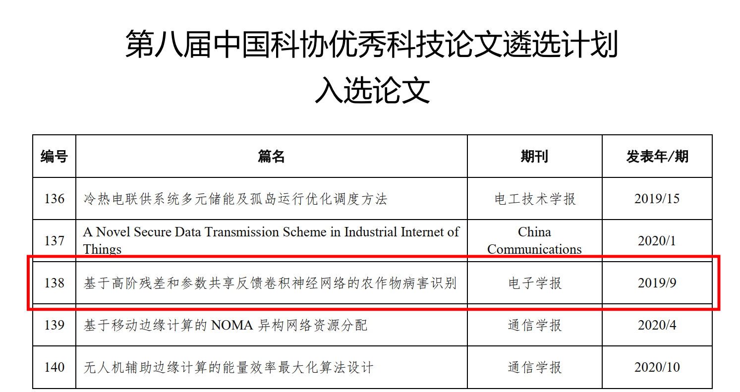 本网讯(互联网学院)近日,中国科学技术协会公布了第八届中国科协优秀科技论文遴选计划结果,我校曾伟辉副教授团队的《基于高阶残差和参数共享反馈卷积神经网络的农作物病害识别》成功入选。