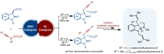 近日,我校物质科学与信息技术研究院宋琎课题组联合中国科学技术大学龚流柱与郭昌教授研究团队,成功合作开发了手性氮杂环卡宾和镍配合物协同催化不对称反应体系,高效实现氧化吲哚衍生物的立体发散性合成,并完成了天然产物(-)-debromoflustramine B及其衍生化合物(-)-C(β-Me)-debromoflustramine B的不对称合成。相关研究成果以“Enantio- and Diastereodivergent N-Heterocyclic Carbene/Nickel Dual-Catalyzed Umpolung Propargylic Substitutions of Enals”为题,发表在J. Am. Chem. Soc.上,并被选为内封面文章。安徽大学为第一通讯单位。