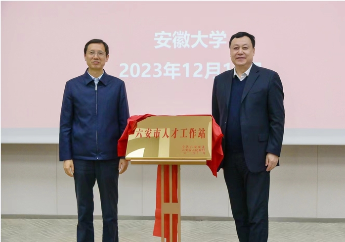 蔡敬民和方正为六安市人才工作站揭牌。王红介绍了六安市与安徽大学校地合作有关情况,孙长银介绍安徽大学科研成果情况。安徽大学电气工程与自动化学院与安徽国科环保设备有限公司签订“人工智能驱动的多污染因子协同治理关键技术研发及产业化项目”协议。
