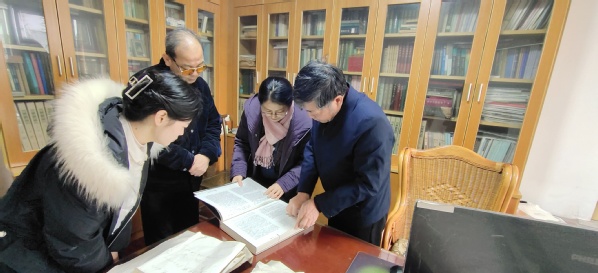 王兰(右二)与刘伯山(右一)翻阅相关研究成果