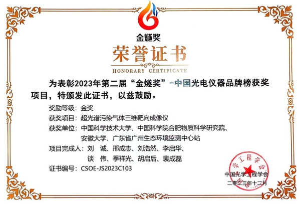 本网讯(物质科学与信息技术研究院 李启华)近日,由我校物质科学与信息技术研究院环境物理与技术研究所刘浩然、李启华,信息材料与智能感知安徽省实验室季祥光作为主要完成人,联合中国科学技术大学刘诚教授、中国科学院合肥物质科学研究院、广东省广州生态环境监测中心站,共同研制的超光谱三维靶向成像仪荣获2023年第二届“金燧奖”中国光电仪器品牌榜金奖。该奖项由中国光学工程学会、中国计量科学研究院主办,重点评选出中国自主研发、制造、生产的高端光电仪器。该项成果被国家自然科学基金委员会重点报道(https://www.nsfc.gov.cn/publish/portal0/tab448/info91409.htm)。