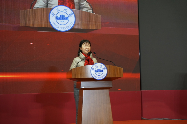 荣休教职工代表鞠红发言,她回顾了自己在安徽大学求学、工作生涯,见证母校的风雨历程、砥砺前行、巨变和发展,与具有专业素养创新意识敬业精神人文情怀的前辈和老师为伍,她深切体会到:宽容的校园文化鼓励个性激发自主,孕育出独立思考的能力,这里是厚植实现梦想的土壤。她感恩母校让生命充满了理想和信念,给予她做人的启迪和方向;祝福参天大树般的母校年年桃李、岁岁芬芳、厚德载物、永铸辉煌。