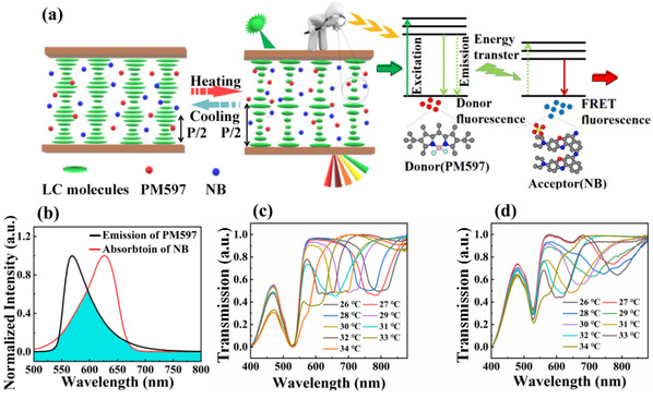 在温度调控激光波长方面,团队在手性液晶中实现了温度调控Förster共振能量转移激光器。通过改变温度驱动液晶带隙的移动,实现激光波长从560 nm(黄色)到700 nm(红色)的连续变化,并利用金纳米棒的局域表面等离子体共振效应,增强激光强度达200倍以上。研究成果以“Efficient and tunable liquid crystal random laser based on plasmonic-enhanced FRET”发表于《APL Photonics》 (DOI: 10.1063/5.0134978;第一作者为博士生屈广阴)。