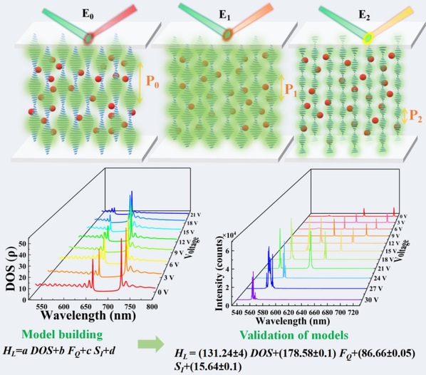 在电场调控液晶带隙激光方面,该团队通过直流电压驱动液晶带隙移动,实现160 nm(560-720 nm)带隙激光波长的调控。激光染料PM597的荧光光谱(550-750nm)的利用率高达80%。利用多元线性回归模型阐明了激光器发射的激光强度与光子态密度、荧光量子产率和内部散射之间的内在关系,为液晶激光的设计提供了理论支撑。研究成果以“Efficient Fluorescence Utilization and Photon Density of States-Driven Design of Liquid Crystal Lasers”发表于光学领域权威期刊《Laser & Photonics Reviews》(DOI: 10.1002/lpor.202301122;第一作者为博士生屈广阴)。
