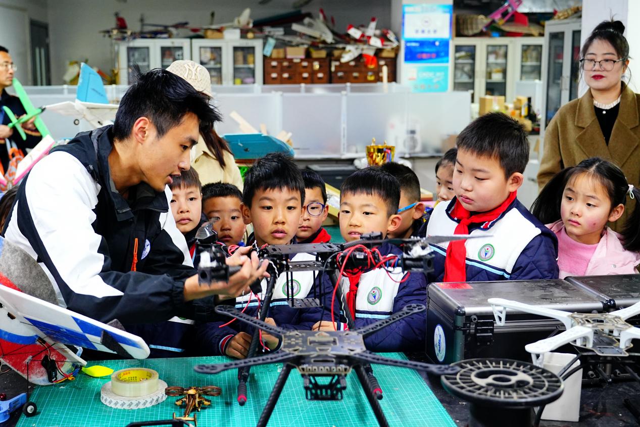在安徽大学航模创新实验室,小朋友们被一架架自主设计和研制的火箭模型、电动滑翔机、对地侦察机等深深吸引。航模队成员向小朋友们深入浅出地讲解了航模飞机的材料使用、图纸设计、搭建过程、飞行原理、科技竞赛等知识。在引导小朋友们亲身体验模拟飞行后,航模队特地奉献了一场精彩的飞行表演,尾拖彩带、垂直悬空、急速旋转、轻盈滑行...各类花式动作引得现场一片欢呼和掌声。“小朋友们,只靠双手便能做出一架能在狂风中与苍穹共舞的飞机,你们也是可以做到的”,航模队队长杨同学鼓励小朋友们时说。