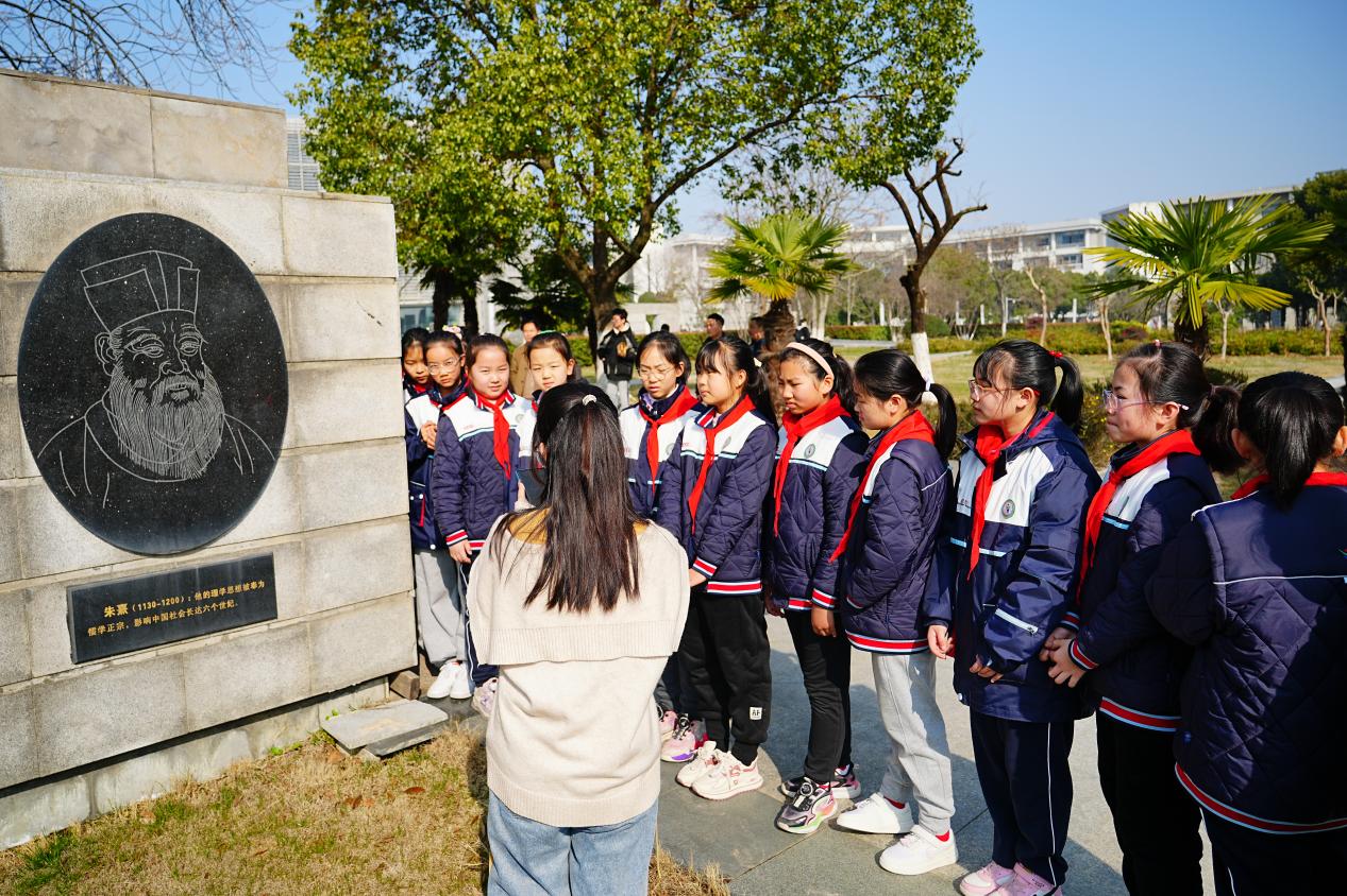 漫步至安徽大学名人墙,“万世师表”孔子、进化论之父达尔文、“外科圣手”华佗、世纪伟人爱因斯坦等古今中外名人雕像庄严伫立在典雅的文典阁前。小朋友们围着志愿者,饶有兴趣地聆听历史名人的生平事迹、精神品质和历史贡献。“通过参观名人展,希望小朋友们能深刻领悟到,每一个伟大人物的背后,都有着不懈的努力和坚定的信念,我们应该铭记这些名人的事迹和精神,站在巨人的肩膀上,要更加努力地学习、探索和创新”,志愿者同学说。