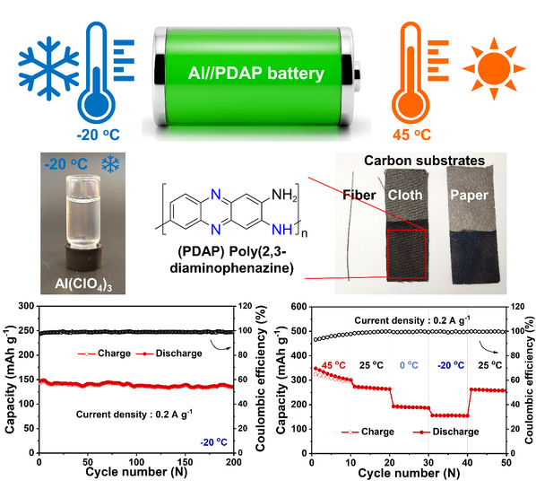 基于此,张朝峰教授课题组设计了一种双极共轭聚(2,3-二氨基吩嗪)(PDAP)正极,用于宽温度范围(−20至45℃)的高性能水系铝离子电池。多个活性单元的结合,包括n型(C=N)和p型(-NH-)基团,赋予PDAP更多的氧化还原反应位点。即使在较宽的温度范围内,Al//PDAP电池也始终表现出优异的电化学性能。该工作为构建适用于水系铝离子电池的高性能有机正极提供了一种很有前途的方法。