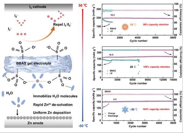基于此,我校物质科学与信息技术研究院张朝峰教授团队设计了一种具有离子选择透过性的双网络聚阴离子水凝胶电解质。水凝胶链上丰富的磺酸根基团在促进锌阳离子的迁移同时,可通过静电相互作用阻碍多碘化物阴离子在电解质中的穿梭。锌-碘全电池在−50到50℃宽温度范围内表现出优异的循环稳定性。该工作为构建适用于宽温域水系锌-碘电池的高性能电解质提供了一种新颖的设计思路。