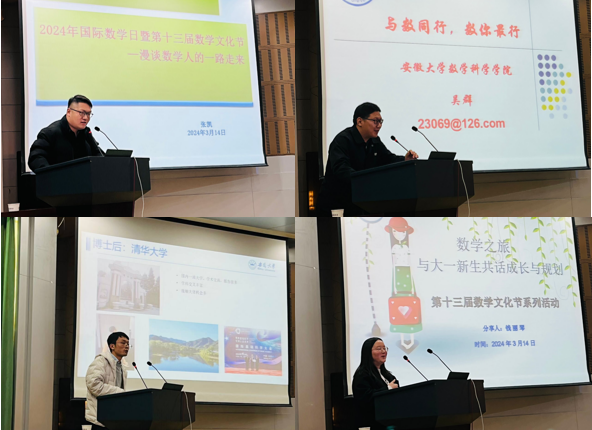 3月14日晚上7:00,“数学文化节大讲堂”在龙河校区逸夫楼图书馆报告厅拉开序幕,数学科学学院党委副书记孟丽梅主持报告会,杨良泽、吴群、张凯、钱丽琴等四位优秀青年教师作分享,240余名师生到场学习。