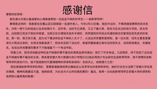 邓先生对俞斯琴这种助人为乐、拾金不昧的行为非常感动。为此,他特向学校相关部门致信,以表感激之情。在感谢信中,他写道:“我深深地被这种拾金不昧做好事不留名的高贵品质所感动,这不就是新时代雷锋精神的传承和发扬吗!”信的最后,邓先生还对安徽大学立德树人的教育工作表示敬意。