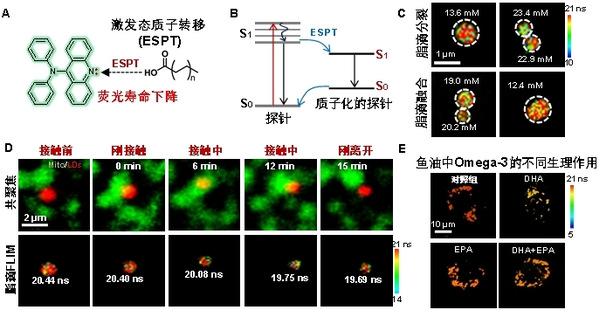 图.A)精确定量脂滴中脂肪酸浓度的荧光寿命探针及其传感机制,B)激发态质子转移过程(ESPT)示意图,C)脂滴分裂(上图)和融合(下图)过程中单个脂滴中脂肪酸浓度变化,D)实时追踪脂滴和线粒体接触时脂滴中脂肪酸产生和输运,E)鱼油中Omega-3多不饱和脂肪酸DHA和EPA对动脉粥样硬化预防的不同生理作用。
