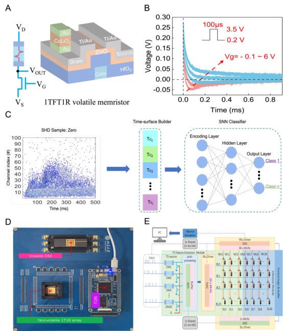 研究人员设计的硬件DTSN神经元由薄膜晶体管(TFT)与Au/CoLiO2/Au动态忆阻器串联集成(1TFT1R),其中TFT作为可调电阻和分压器件。DTSN神经元在接收固定脉冲信号条件下,DTSN神经元的动力学具有可重构特性,随着栅极电压的增大可以实现zero-sum时间核到指数时间核的转换。在这项工作中,基于DTSN神经元的时间核动力学可将语音信号中的时空特征转化为时间表面(time-surface)表示,作为后端脉冲神经网络训练学习的语音信号特征值,实现了具有低功耗、高能效计算的轻量级脉冲神经网络模型的语音识别硬件系统。该硬件系统由基于DTSN神经元的语音事件信号特征提取层与浅层脉冲神经网络分类器两部分构成,实现了前端的语音信号处理和后端语音识别过程识别一体化。由于基于忆阻器的DTSN神经元的zero-sum时间核具有高效的语音事件信号特征提取能力和抗噪声能力,极大地简化了针对语音识别的脉冲神经网络硬件化复杂度、提高了语音识别的精度(95.91%)与鲁棒性。