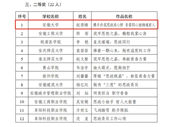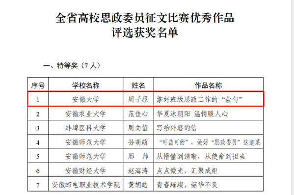 本网讯(学生处 乔媛媛)近日,安徽省高等学校思想政治教育研究会公布全省高校思政委员主题征文比赛获奖名单,我校通过遴选推荐的两篇原创作品分获特等奖和二等奖,在全省高校中名列前茅。