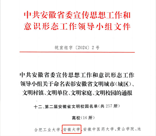 本网讯(融媒体中心)近日,根据《中共安徽省委宣传思想工作和意识形态工作领导小组关于命名表彰安徽省文明城市(城区)、文明村镇、文明单位、文明家庭、文明校园的通报》,我校荣获“第二届安徽省文明校园”称号。