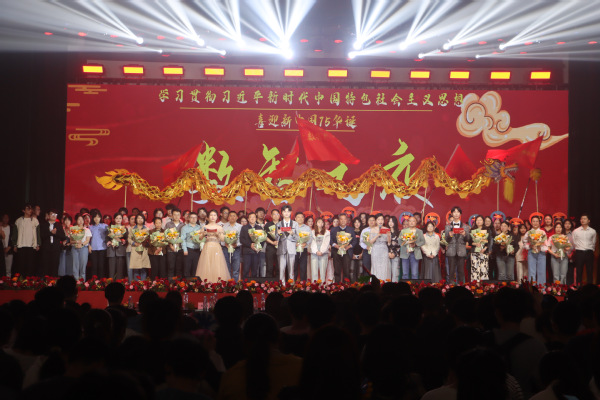 整场晚会20个节目精彩纷呈,内容多元,涵盖师生同台联唱、相声小品、器乐合奏、创意配音等多种表演形式,为师生充分提供了展示才艺和自我的舞台。学院全体系主任教师深情朗诵《中华颂》致敬伟大祖国母亲,表达对未来的美好展望。全体行政管理人员合唱一曲《情歌王》,展现了青年教工的活力与风采。歌曲《雪龙吟》《我和我的祖国》传递红色“星火”,筑牢红色信仰,激励着莘莘学子发扬更快、更高、更强的进取精神。舞蹈《敦煌》展示了我国地域舞蹈的独特特色,表现出中华优秀传统文化的魅力与精髓。