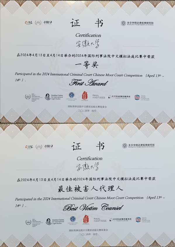 在4月13日的正赛第一轮中,每支赛队分别代表辩方律师、检方律师以及被害人代理人进行3轮庭辩。经过每轮比赛陈述与反驳两个环节的激烈交锋,我校代表队成功晋级前24强,继续参与次日举行的正赛庭辩第二轮。在第二轮对阵中,我校代表队再接再厉,一路过关斩将,最终以优异成绩荣获全国一等奖、最佳被害人代理人2项团体奖项,顺利晋级国际赛。