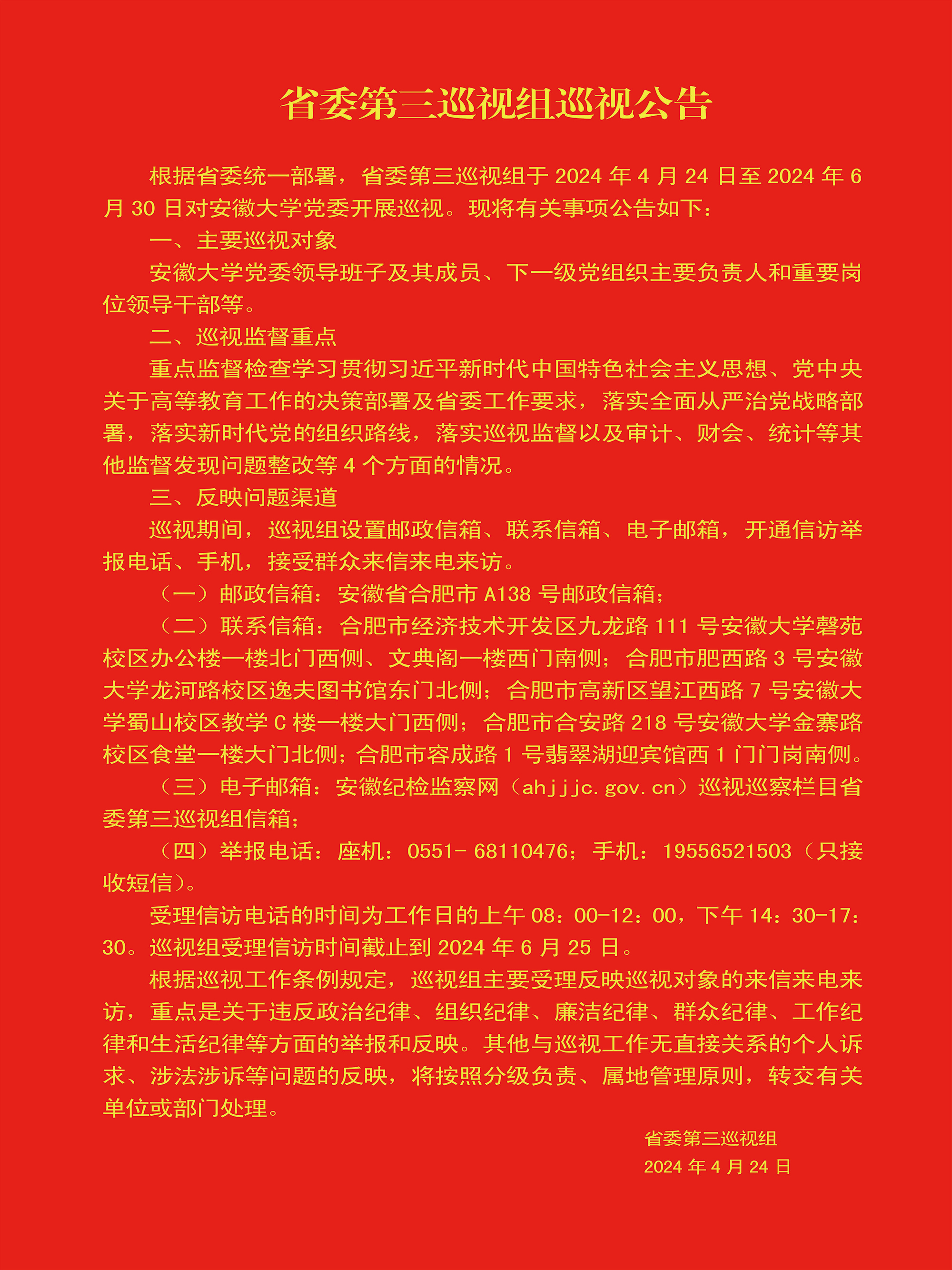省委第三巡视组巡视公告