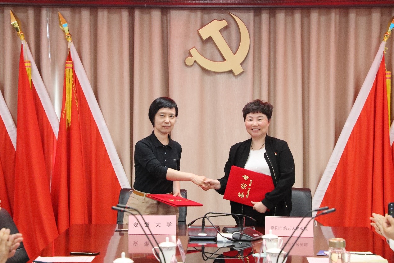 在双方人员见证下,张敏与院方代表周皖青共同签署了安徽大学与阜阳市第五人民医院战略合作协议。根据协议,双方将围绕联合开展人才培养、学科发展与实习实训基地建设和科研及成果转化平台建设三个方面开展深度合作。