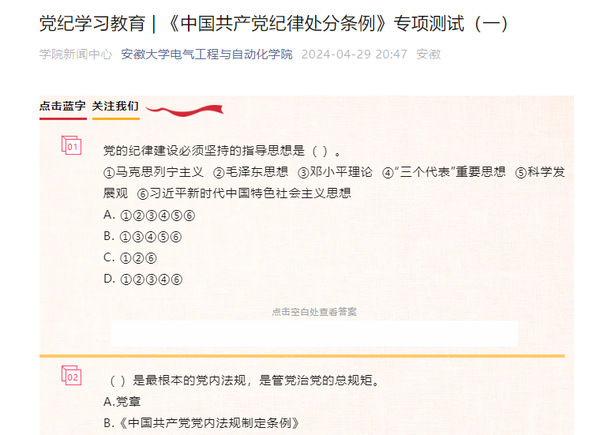 本网讯(电气工程与自动化学院 燕瑞)为扎实推动党纪学习教育走深走实,让师生党员准确把握《中国共产党纪律处分条例》主旨要义和规定要求,主动融入、积极践行,在学纪、知纪、明纪、守纪上取得新进步新提升,以严明的纪律确保全院师生党员自觉在思想上、政治上、行动上同以习近平同志为核心的党中央保持高度一致,电气工程与自动化学院党委制作《中国共产党纪律处分条例》专项学习题库,分3期发布,在学习结束后将组织全院党员、发展对象和入党积极分子等参加线上测试,检验和巩固学习成效。