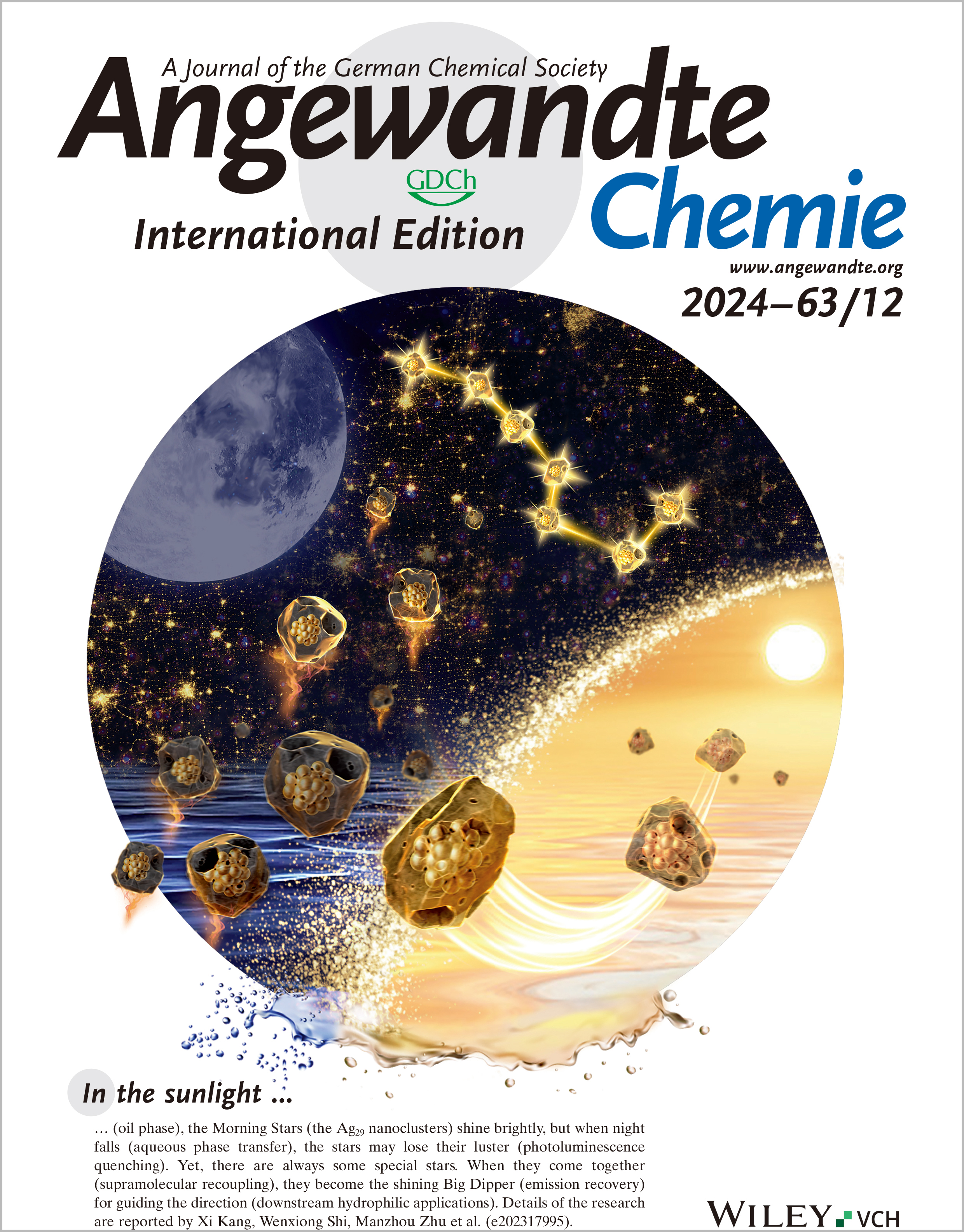 本网讯(化学化工学院 康熙)近日,我校化学化工学院朱满洲/康熙团队在金属团簇荧光调控研究方面取得新进展,相关研究成果已在化学领域国际顶级期刊德国应用化学上在线发表,并被选作杂志封面(图1)。安徽大学化学化工学院2021级博士研究生沈宏磊和硕士研究生徐嘉伟为论文共同第一作者,化学化工学院朱满洲教授、康熙教授和天津理工大学匙文雄研究员为共同通讯作者,安徽大学化学化工学院为第一通讯单位。