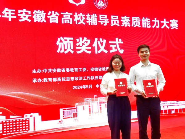 本网讯(学生处)5月9日至11日,由中共安徽省委教育工委、安徽省教育厅主办的2024年安徽省高校辅导员素质能力大赛在芜湖举行,我校大数据与统计学院辅导员林志超老师荣获一等奖,经济学院辅导员李露露老师荣获二等奖。