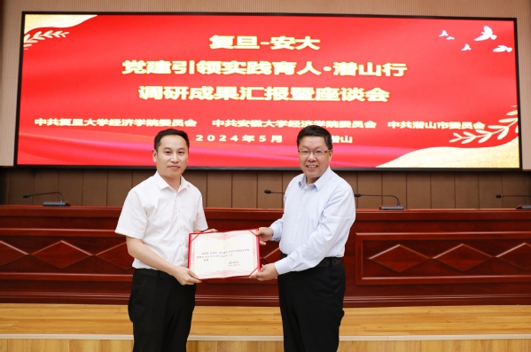 周飞为潜山市委常委、组织部部长产敬春,天柱山镇党委副书记、镇长陈泉丰颁发校友导师聘书。复旦大学经济学院党委副书记李志青和安徽大学经济学院党委书记田淑英为潜山市9名政府和企业代表颁发联合实践导师聘书。