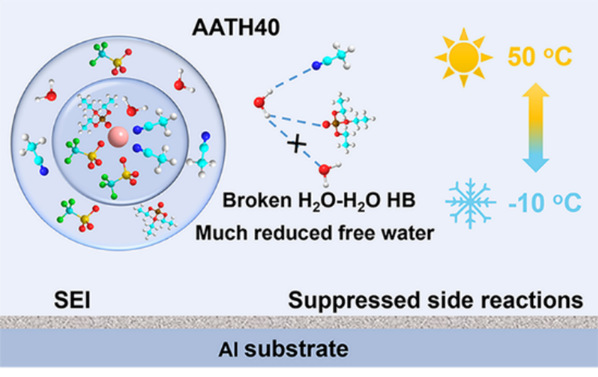 基于此,材料学部张朝峰教授团队设计了一种由Al(OTf)3、乙腈(AN)、磷酸三乙酯(TEP)和水组成的水合共晶电解液(AATH40)。该电解液使AAIBs在温度为−10至50°C的宽温度范围内表现出更好的循环稳定性。AN和TEP的引入改变了氢键环境,AATH40具有贫水溶剂化结构(Al(AN)2(TEP)(OTf)2(H2O)]3+),从而降低了电解质中的水活性,有效地抑制了副反应,降低了冻结点,拓宽了电解质的电化学窗口,延长了电池的使用寿命。此外,AN和TEP对Al3+具有很强的溶剂化能力,可以在电极/电解质界面上形成溶质衍生的固体电解质界面(SEI),有效地抑制HER和腐蚀,从而进一步提高电池的电化学性能。