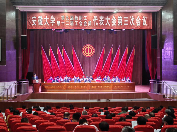 本网讯(融媒体中心)5月23日下午,安徽大学第九届教职工代表大会暨第十二届工会会员代表大会第三次会议在艺术楼小剧场召开。会议强调,更加紧密地团结在以习近平同志为核心的党中央周围,认真贯彻省委省政府部署要求,在校党委的坚强领导下,坚定信心、开拓进取,努力完成今年各项工作任务,加快推进“双一流”高质量建设,为全面建设社会主义现代化国家和现代化美好安徽作出新贡献!