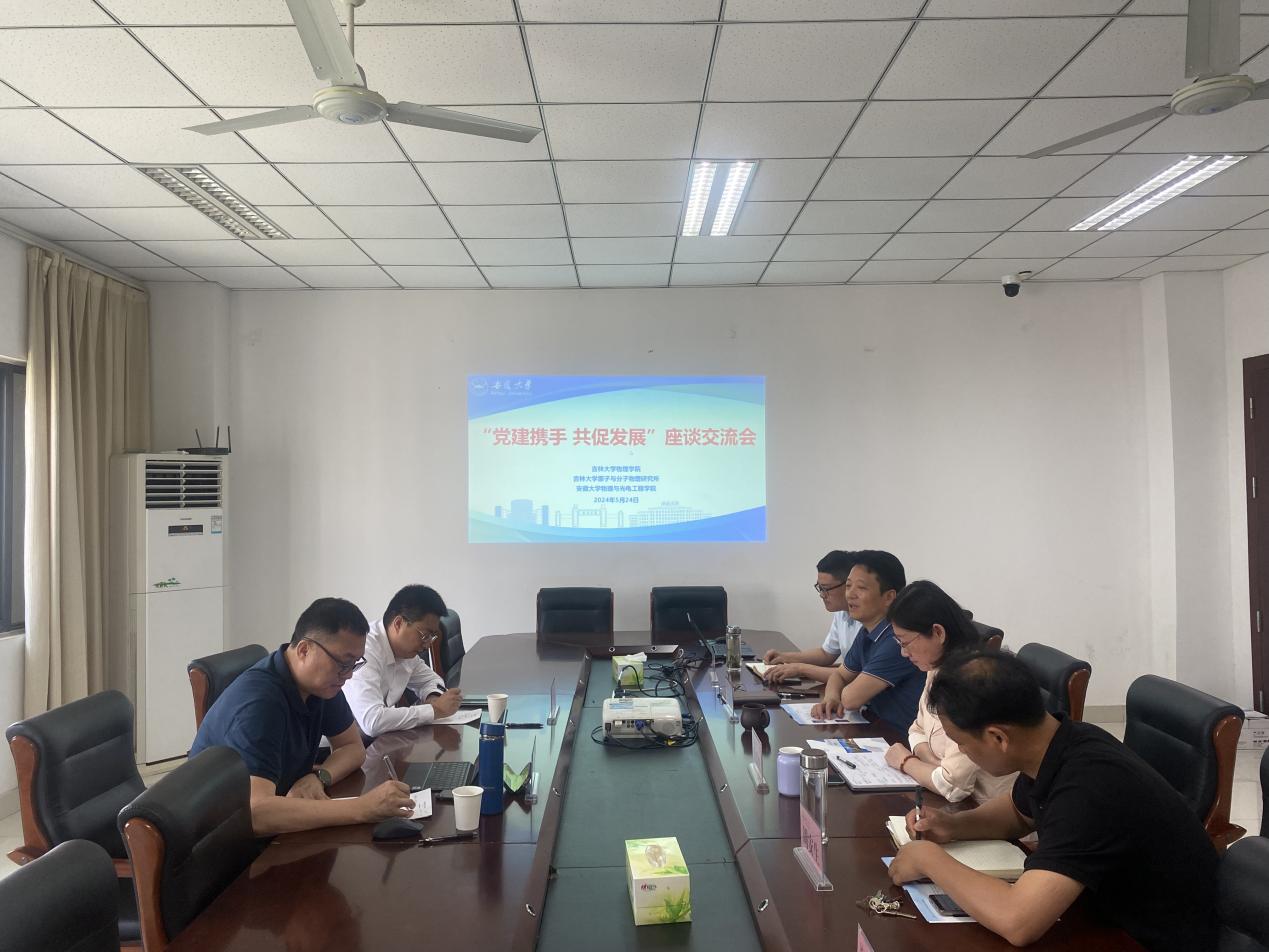田明亮介绍了学院历史、发展沿革及基本情况,围绕学院科研平台建设及科普工作与对方展开交流。徐震虹从政治引领、党建主体责任、师生思想政治教育以及促进事业发展等方面简要介绍学院党建工作,围绕党支部争先创优、党建品牌凝练,以及基层党组织如何推进“一融双高”的建设思考与对方充分交换意见。唐宗明介绍了吉林大学物理学院建设发展历史和基本现状,并深入分享党建引领推动人才队伍建设的经验做法。李鑫介绍了研究所建设发展历史和基本现状,并围绕研究所的党建情况和特色工作进行了详细介绍。