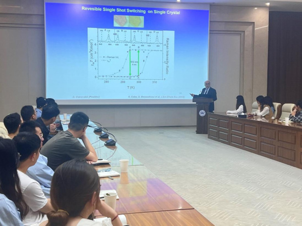 Azzedine Bousseksou院士围绕“自旋交叉分子科学:从分子到设备”中的挑战性科学问题,结合其课题组近年来的丰硕成果,先后介绍了“分子双稳定性-自旋交叉材料的发展历程”、“自旋交叉纳米材料在传感器和存储设备的应用”以及“自旋交叉材料在人造肌肉方面的应用”等内容。他随后详细阐述了自旋交叉现象的基本原理和其在不同外部扰动下的行为,自旋交叉材料在实现高灵敏度传感器、先进存储设备以及仿生机械装置方面的巨大潜力。报告结束后,Azzedine Bousseksou院士针对在场师生所提出的诸多问题做出了耐心细致地解答。