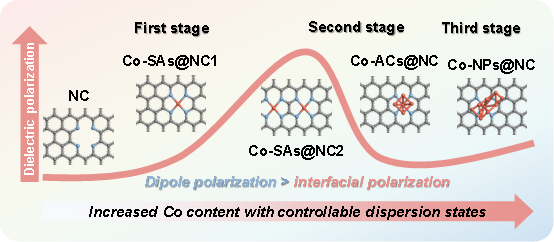 基于此,张惠教授课题组设计开发了一种在原子尺度上通过调控金属物相和基质之间的电子结构和界面微环境,实现了对电磁波频率响应的精确控制。密度泛函理论进一步揭示了Co原子的d电子与配位N原子的p电子之间的轨道杂化现象诱导了N位点的电子再分布,进而增强了电偶极子极化和室温磁性。这一研究为阐述偶极极化和丰富电磁衰减机制提供了新的思路。