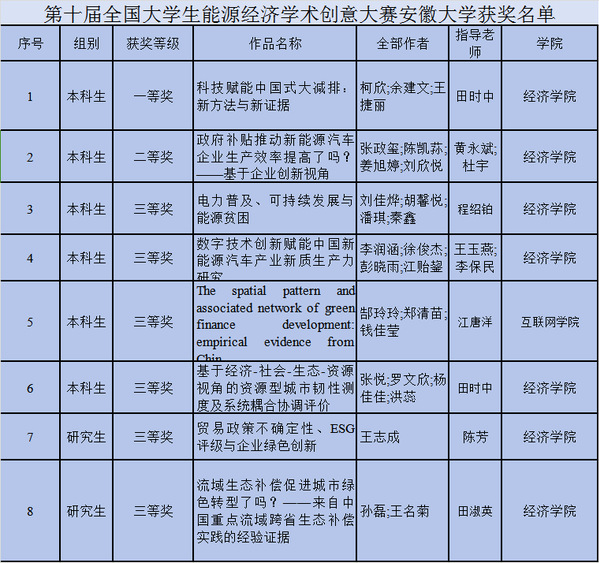 本次大会由中国优选法统筹法与经济数学研究会、中国地质大学(北京)和中国高等教育学会资源能源教育分会联合主办,参赛对象为全日制普通高校在校本科生、硕士博士研究生,大赛分为本科生组和研究生组两个组别和校赛、区域赛、国赛三级赛事。本届大赛共有全国561所高校参加,报名团队17994支,参与人数近10万人。我校教务处、研究生院和经济学院联合承办了第十届全国大学生能源经济学术创意大赛安徽大学校赛及安徽赛区省赛。