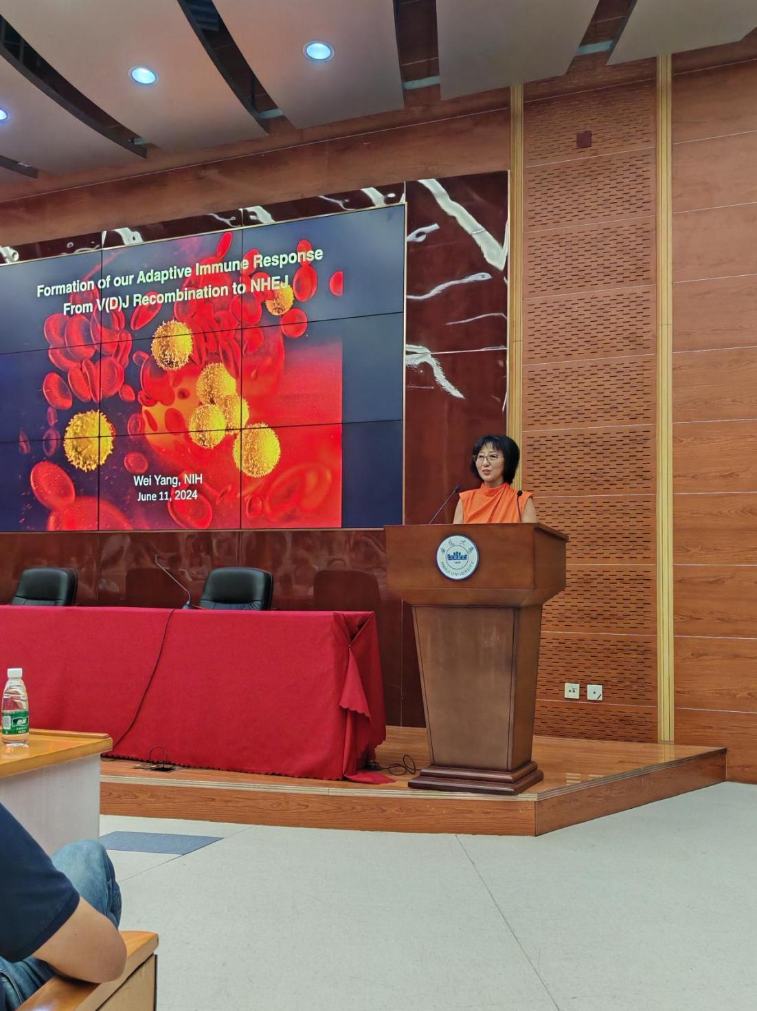 同日,杨薇在安徽大学磬苑校区文典阁一楼报告厅作学术报告。报告以“适应性免疫的形成:从V(D)J重组到非同源末端连接”为主题,生命科学学院党委书记王永中主持。