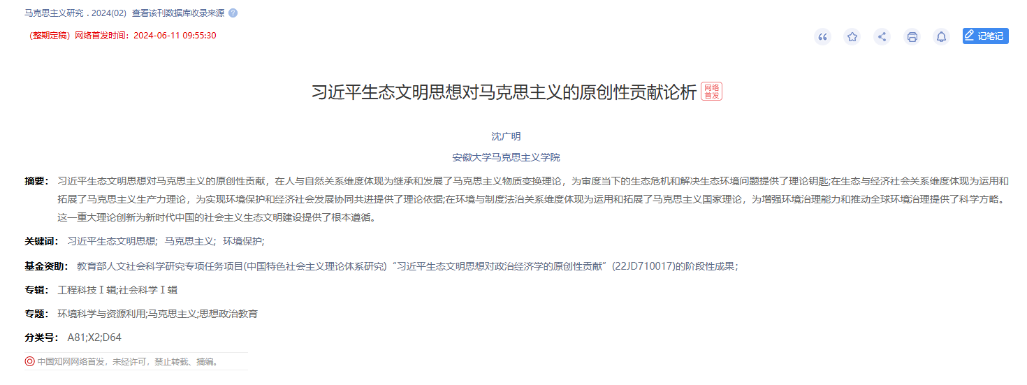 本网讯(马克思主义学院)近日,我校马克思主义学院沈广明老师的论文《习近平生态文明思想对马克思主义的原创性贡献论析》在《马克思主义研究》2024年第2期发表。该文提出,习近平生态文明思想对马克思主义的原创性贡献,在人与自然关系维度体现为继承和发展了马克思主义物质变换理论,为审度当下的生态危机和解决生态环境问题提供了理论钥匙;在生态与经济社会关系维度体现为拓新和运用了马克思主义生产力理论,为实现环境保护和经济社会发展协同共进提供了理论依据;在环境与制度法治关系维度体现为运用和拓展了马克思主义国家理论,为增强环境治理能力和推动全球环境治理提供了科学方略。文章指出,这一重大理论创新为新时代中国特色社会主义生态文明建设提供了根本遵循。
