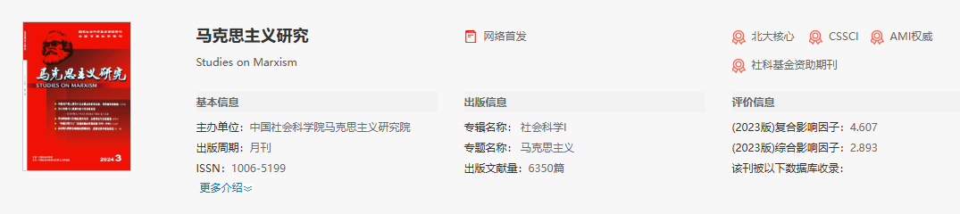《马克思主义研究》由中国社会科学院主管、中国社会科学院马克思主义研究院主办,是以专门研究和宣传马克思主义整体理论为宗旨的大型学术理论刊物。