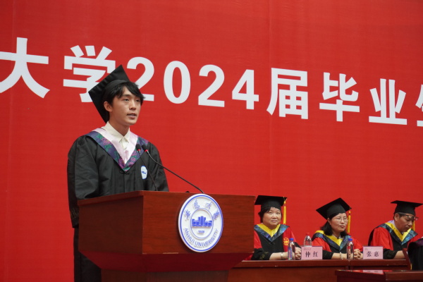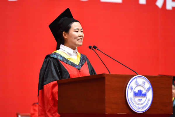毕业本科生代表、马克思主义学院2020级思想政治教育专业许腾腾和毕业研究生代表、电子信息工程学院2021级电路与系统专业博士研究生张寒苏从感恩母校出发,回顾了校园生活,他们表示,将珍爱“安大人”这个称谓,用一生的时间践行母校的嘱托,不辜负母校的期望,怀揣母校的期许,勇敢走向未来,努力为加快实现高水平科技自立自强贡献一份力量。教师代表、商学院教授杜鹏程从如何打破周而复始的岁月出发,号召同学们要始终牢记校训精神,勇立时代潮头,争做时代先锋,让青春在为实现中华民族伟大复兴的奋斗中焕发出更加绚丽的光彩,成为各行各业闪闪发光的安大人!