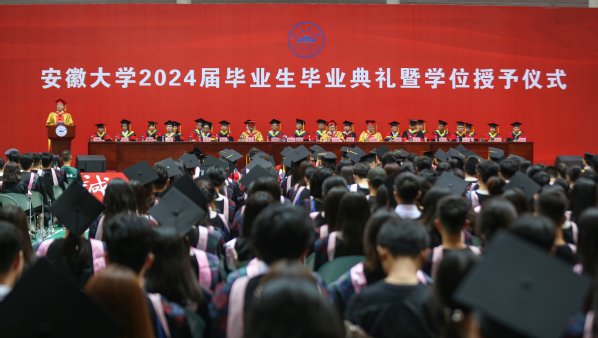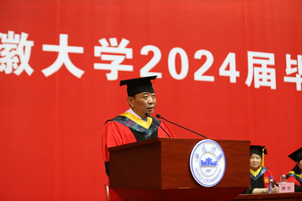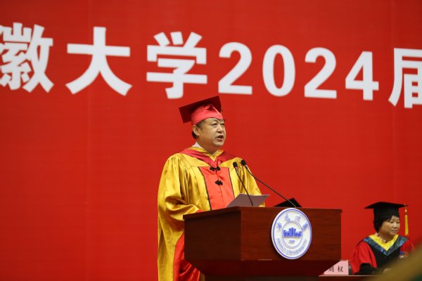 蔡敬民在主持时说,今年是新中国成立75周年,是实现“十四五”规划目标任务的关键一年。在推进中国式现代化的壮阔征程上,在发展新质生产力、推动高质量发展的火热实践中,同学们恰逢其时、重任在肩,施展才干的天地无比广阔,实现梦想的前景无比光明。近几年,学校坚持“服务安徽、立地顶天、开放合作、融合发展”,通过“调结构、转功能、增体量、提质量”,探索地方高校突破“稳态结构”、重塑办学体系、建设一流大学的发展新路,为同学们成长成才奠定了坚实基础。当前,学校正全力推进“双一流”高质量建设,加快推进未来学院校区建设,朝着建设世界一流大学的目标奋勇前进。希望广大毕业生坚定不移听党话、跟党走,坚持以习近平新时代中国特色社会主义思想为指导,在新赛道新天地展现青春作为、彰显青春风采、贡献青春力量,奋力书写为中国式现代化挺膺担当的青春篇章。