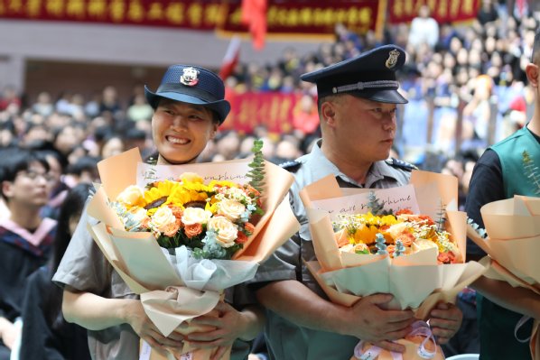 在典礼上,毕业纪念片《青春主演》带大家回顾与母校一同勇毅前行的青春历程。毕业生代表向后勤系统工作人员代表献花表达了他们的感恩之情。毕业典礼结束之际,掌声与乐声再次响起。“潜岳苍苍,江淮汤汤。夏商肇启,雍容汉唐。文化丕成,民族是昌。莘莘多士,跻兹上庠”。伴随着校歌,2024届毕业生秉承着“至诚至坚,博学笃行”的校训精神,扬帆起航,于更高处博览天地,用实际行动书写精彩人生。