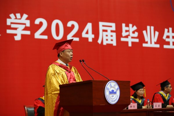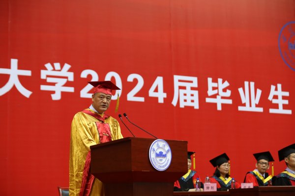孙长银代表学校向今年毕业的同学们表示热烈的祝贺。向悉心指导的教职员工和辛勤培育的毕业生家长致以崇高的敬意和衷心的感谢。他说,几年来,伴随着同学们成长成才,学校“双一流”建设也迈出铿锵步伐。这些成绩的取得,既凝聚着全体教职工的踔厉奋发和不懈努力,也包含着广大同学的积极支持和热情参与。当前,新一轮科技革命和产业变革突飞猛进,以生成式人工智能为代表的新应用、新产品加速涌现,以“创新”为特点、“质优”为关键的新质生产力加快形成,既为经济社会发展注入新动能,也给个人成长进步带来新挑战。他勉励同学们要坚定远大理想,瞄准新赛道打造新优势;坚持崇德修身,汲取新知识锤炼新本领;担当时代重任,展现新作为创造新业绩;勇于砥砺奋斗,把握新机遇开拓新天地。