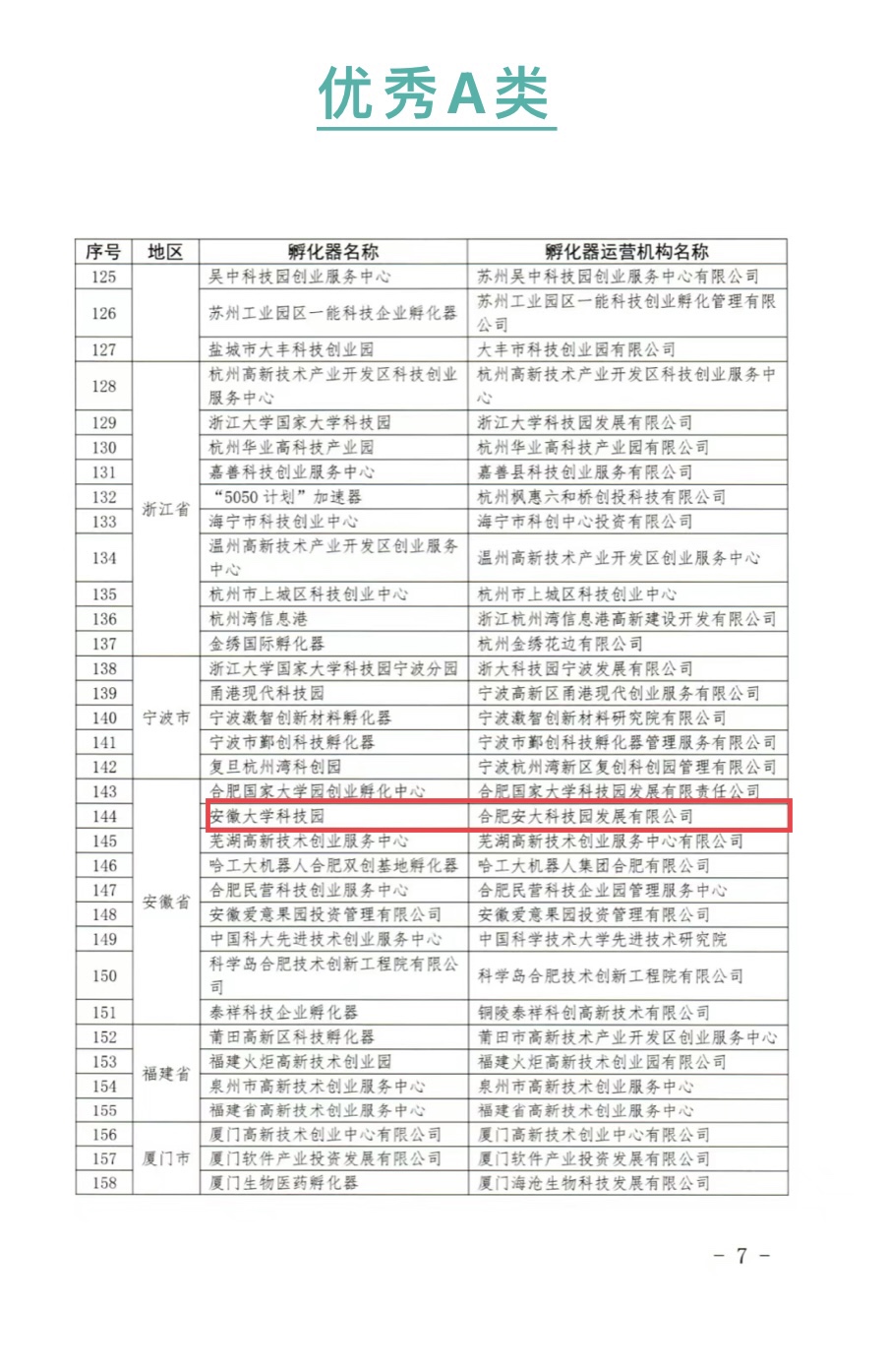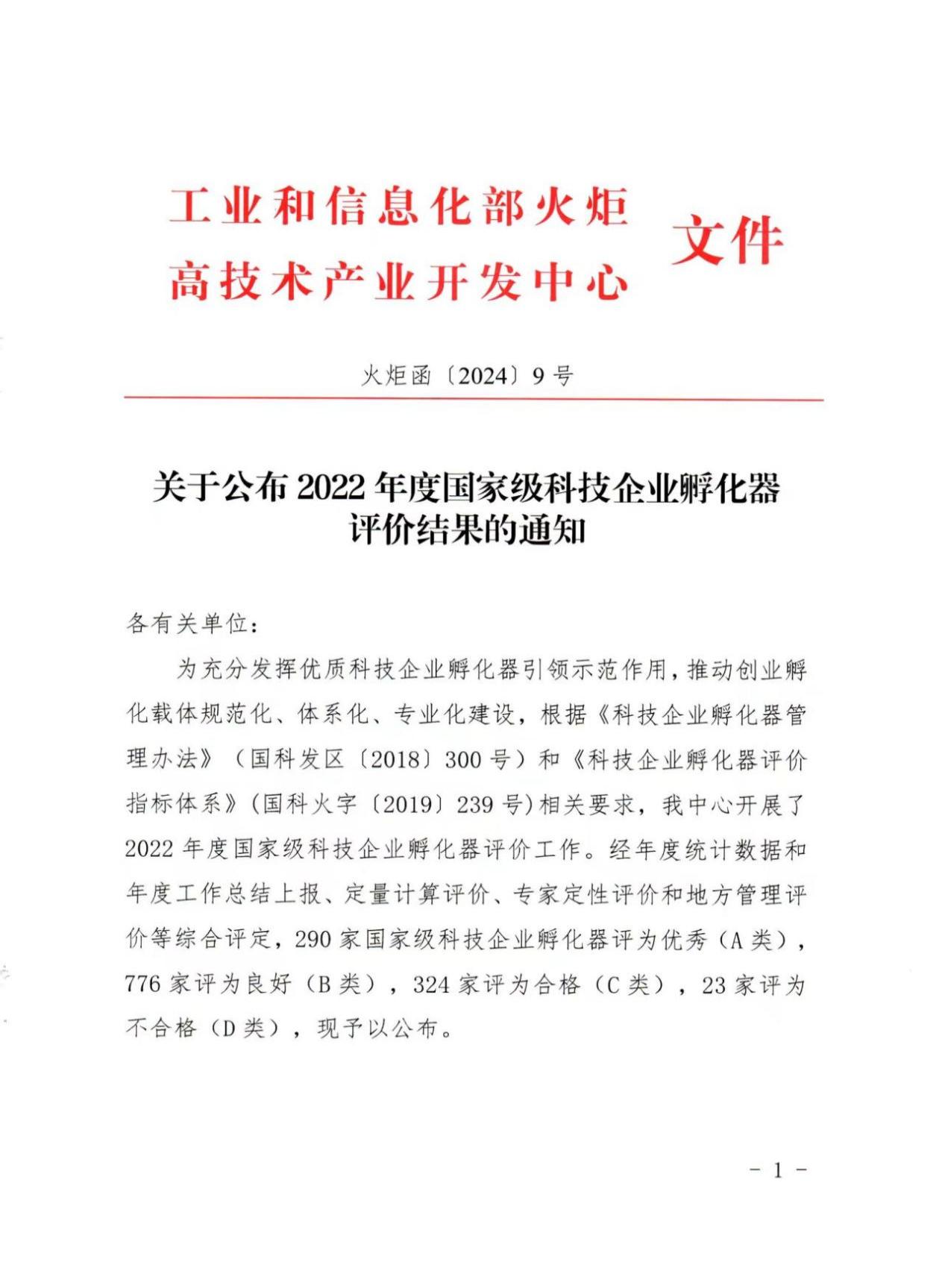 本网讯(资产经营公司)日前,工信部火炬高技术产业开发中心发布了《关于公布2022年度国家级科技企业孵化器评价结果的通知》(火炬函〔2024〕9号)。本次考核评价共有1413家国家级科技企业孵化器参加,经过年度统计数据、年度工作总结上报、定量计算评价、专家定性评价和地方管理评价等综合评定,安徽大学科技园(合肥安大科技园发展有限公司)被评为优秀(A类)级别,在全省国家级科技企业孵化器中位列第二,这也是自2019年以来连续4年获评优秀(A类)。