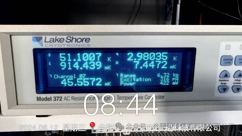 经现场测试,该设备连续运行最低温度达7.45mK(国内第一,国际领先),制冷功率600μW @100mK、15μW @20mK,冷板直径300mm,10mK样品空间深度达到350mm,降温时间(300K至10mk)小于30h,指标突破国产商业化批量生产稀释制冷机的新纪录,达到国内领先、国际一流水平。