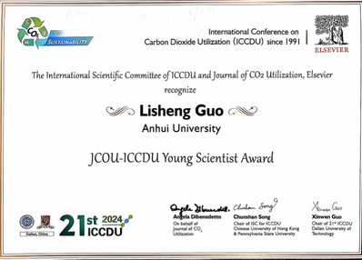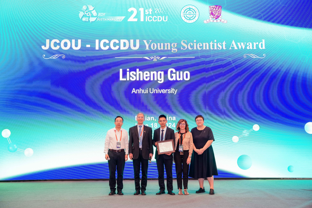 本网讯(化学化工学院 郭立升)日前,在大连举办的第21届国际二氧化碳利用大会(ICCDU)上,我校化学化工学院工业催化团队青年教师郭立升荣获“JCOU-ICCDU青年科学家奖”(JCOU-ICCDU Young Scientist Award)。第21届国际二氧化碳利用大会主席、大连理工大学郭新闻教授、香港中文大学宋春山教授、ICCDU国际科学委员会副主席Angela Dibenedetto教授、Elsevier资深出版人Emilie Wang博士共同为获奖者颁发证书。