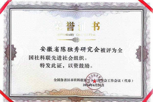 此次会议旨在表彰各方面取得突出成绩的组织。安徽省陈独秀研究会主要负责人主持的系列科研成果获得安徽省“五个一工程”奖(2023年),安徽省社会科学奖二等奖(2022年),安徽省“三项课题”研究活动一等奖3项(2022年2项、2023年1项),安徽省“三项课题”研究活动二等奖2项,研究会连续获评2022年、2023年度“三项课题”研究活动先进单位。本会专家先后主编了《安徽红色历史记忆丛书》(2021年)、参与国家社科基金重大专项项目“抗美援朝战争口述资料采录与整理”并访谈200余位抗美援朝老兵,指导安庆独秀园展板文稿等,为红色文化传播贡献力量。