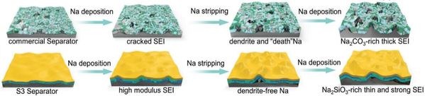 本网讯(化学化工学院)高能量密度的锂、钠电池已成为目前最有前景的能源存储设备之一,隔膜作为电池的重要组成部分,其电化学稳定性、热稳定性以及诱导形成的电极表面界面层(SEI)在很大程度上决定着电池的安全性和循环寿命。近日,化学化工学院侯之国、杨斌老师与南开大学赵庆团队合作,针对电极/电解质界面,利用二维纳米片材料设计钠电隔膜诱导在钠金属电极表面形成高强度、高稳定性、高钠离子传导性Na2SiO3-rich的SEI层,抑制钠枝晶生长,改善钠金属电池的循环寿命。相关研究以“High Modulus Na2SiO3-Rich Solid Electrolyte Interphase Enable Long-Cycle and Energy-Dense Sodium Metal Battery”为题发表在材料科学领域TOP期刊《Advanced Functional Materials》上(DOI: 10.1002/adfm.202407783),安徽大学化学化工学院2022级硕士研究生杨子强为论文第一作者,化学化工学院侯之国老师和南开大学赵庆研究员为本文共同通讯作者,安徽大学为第一通讯单位。