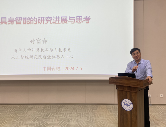 本网讯(人工智能学院)7月5日下午,清华大学孙富春教授应邀来我校交流,在安徽大学磬苑校区材料科学大楼A101作题为《具身智能的研究进展和思考》的学术报告。报告会由校党委副书记、校长孙长银主持,人工智能学院、计算机科学与技术学院等相关专业师生参加报告会。